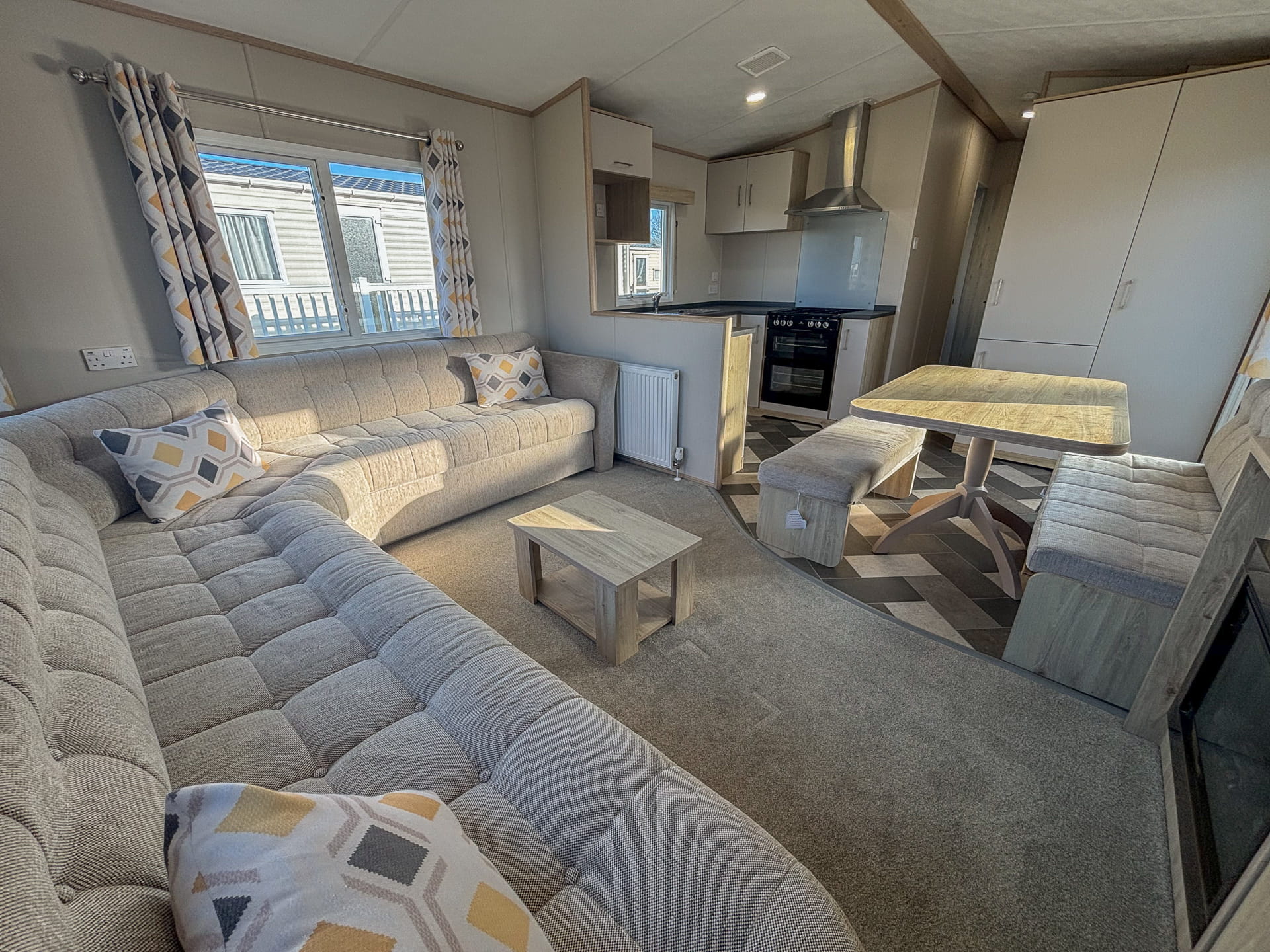 The large, functional kitchen has cashmere grey doors and comes with everything you need to cook up a family meal! Including a gas cooker, optional microwave, integral fridge freezer and stainless steel sink.